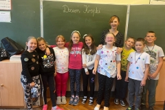 Tradycyjnie już, 15 września nasza szkoła wzięła udział w Międzynarodowym Dniu Kropki (International Dot Day). Nasi najmłodsi od samego rana, z uśmiechami na twarzach uczestniczyli w wielu wspaniałych aktywnościach, mających na celu pobudzenie kreatywności, odkrycie swoich mocnych stron, a nierzadko także talentów! Uczniowie poznali historię małej Vashti, która dzięki mądrej nauczycielce uwierzyła w siebie i odkryła w sobie talent, do malowania kropek. To właśnie jej historia zapoczątkowała to wyjątkowe święto, podczas którego uczniowie nie tylko ubierają się w kropkowe stroje, ale też mają doskonałą okazję, by dać upust swojej twórczości i kreatywności. Motyw kropki pojawiał się przez cały dzień, we wszystkich zabawach i aktywnościach, powstało wiele kropkowych dzieł sztuki, a na pamiątkę można było zrobić sobie zdjęcie przy kropkowej tablicy. To był bardzo udany dzień!