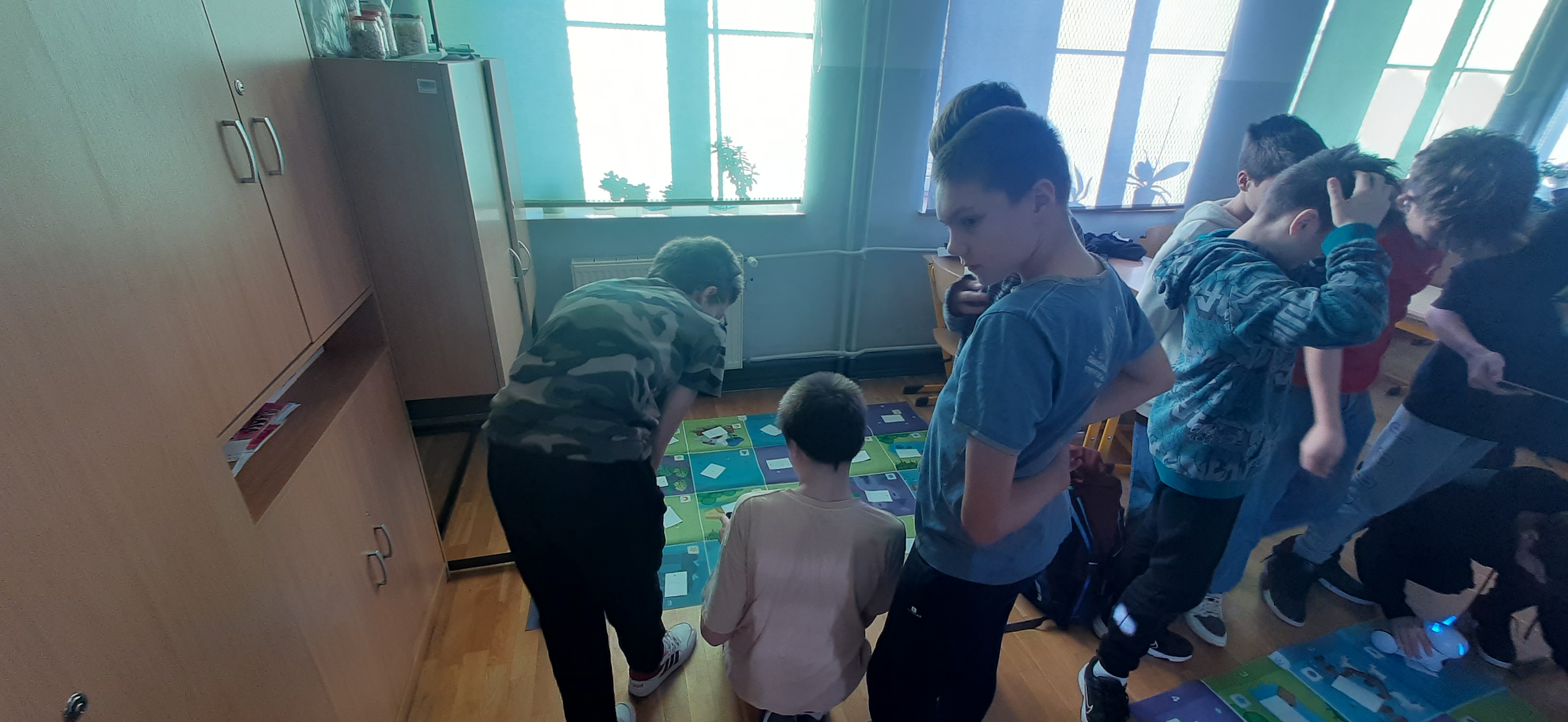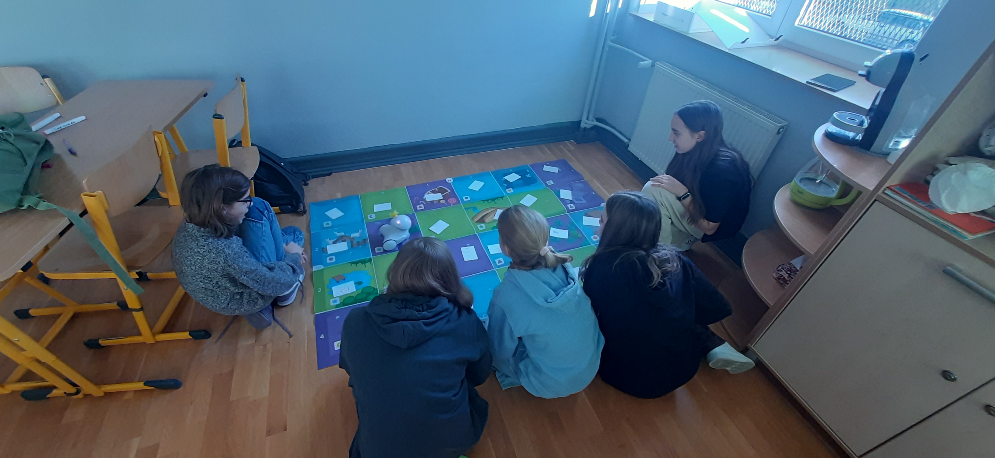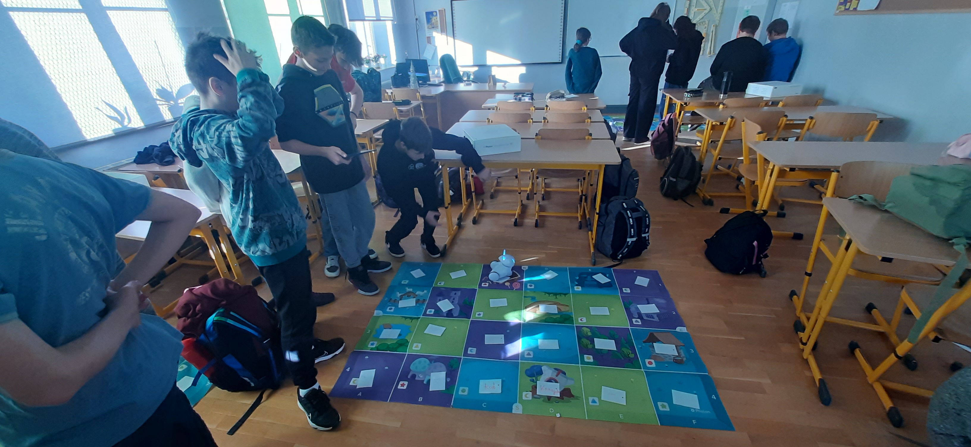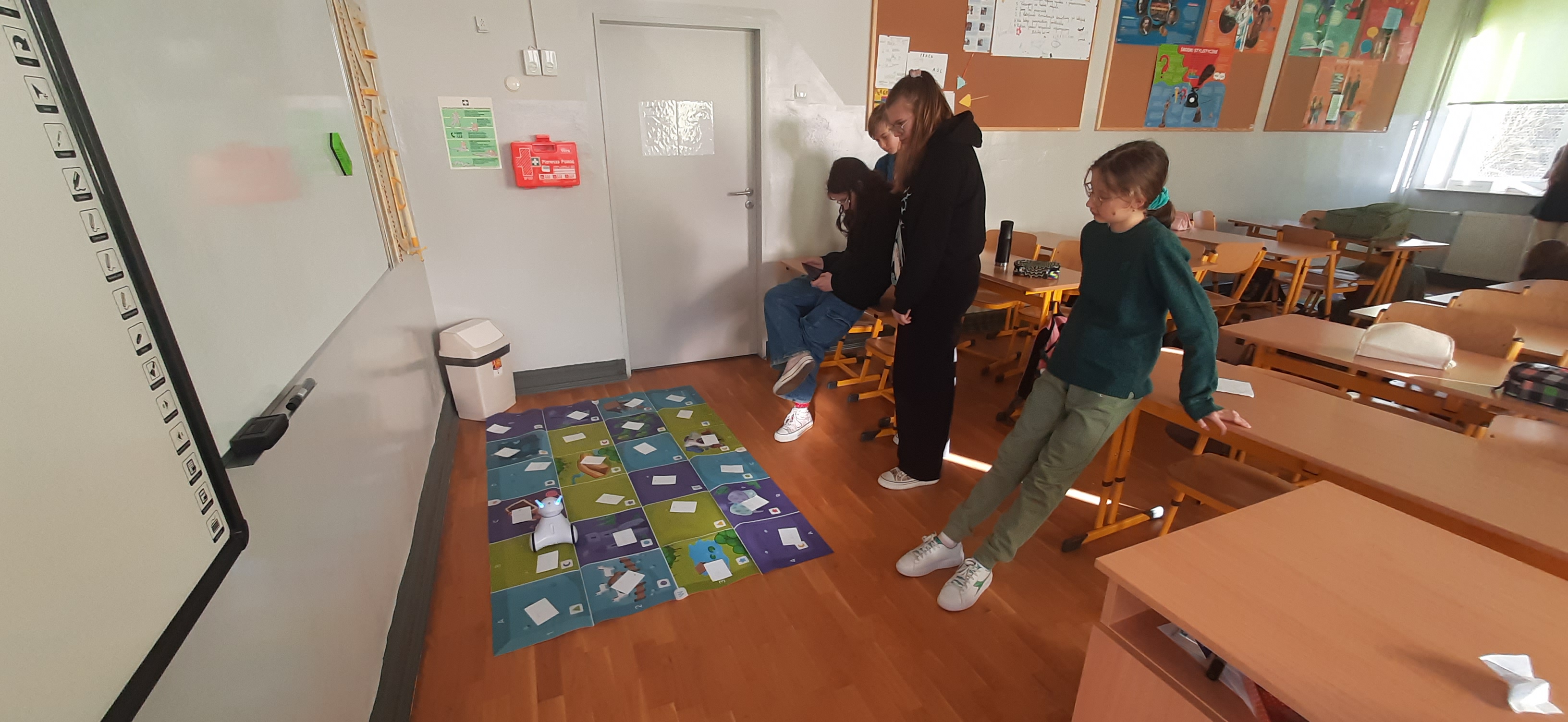 W klasie 7a na języku polskim zagościły roboty. Zadaniem uczniów było nauczyć je rozróżniania rzeczowników, czasowników, przymiotników i przysłówków. Na macie pełnej wyrazów robot poruszał się wyszukując określone części mowy.