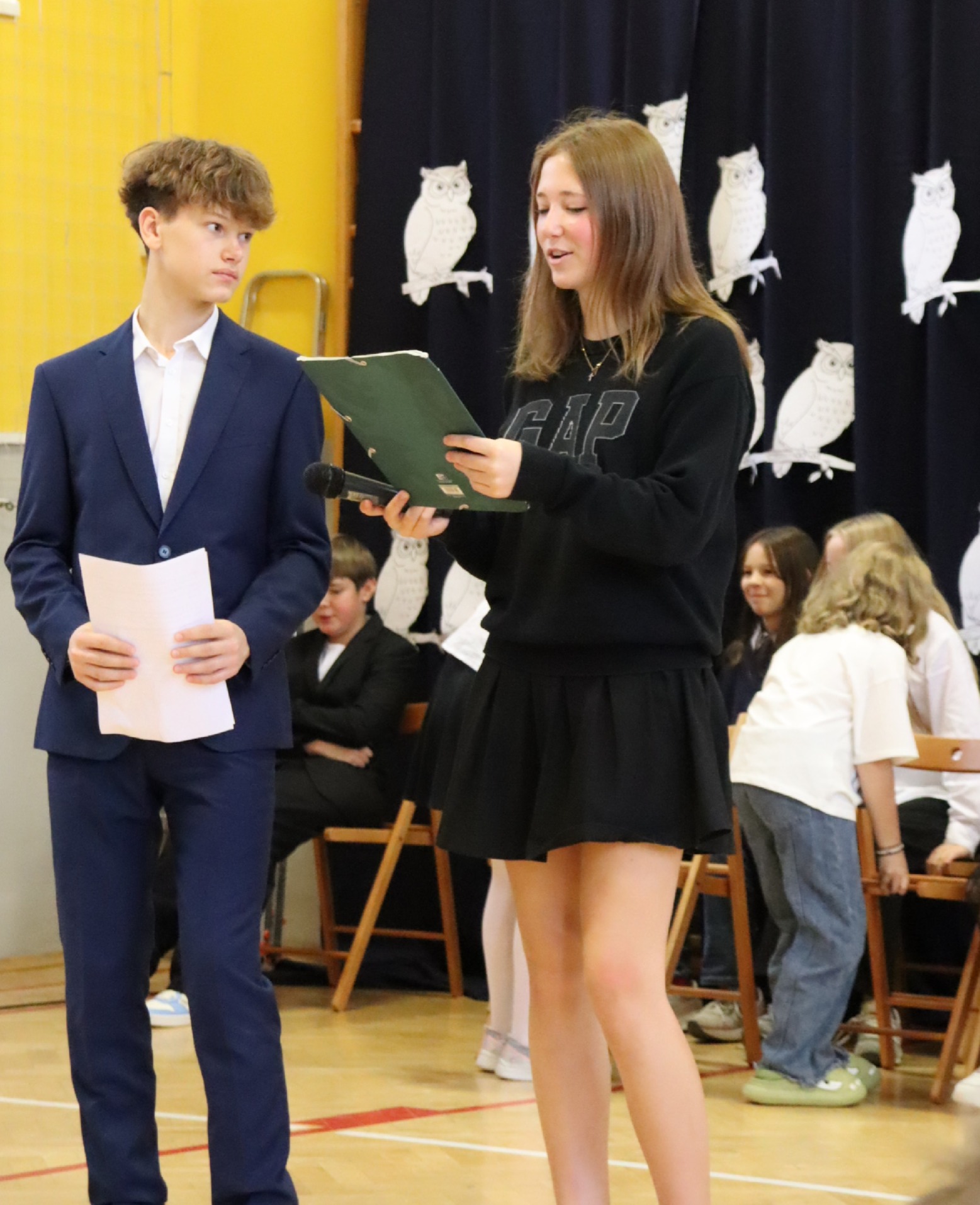 Podczas uroczystości występy muzyczno-taneczne przygotowali: Tosia Augustyn i Ania Skorupska, Hania Partyka, Antonia Skłodowska, szkolny chór oraz grupa taneczna SALAKE w składzie: Marta Cyrankiewicz, Natalia i Olga Philipczyk oraz Karolina Tokarek. Klasa 6b z kolei przeniosła nas w odległą przyszłość prezentując scenkę, w której nauczycieli zastąpiła sztuczna inteligencja. Ich występy wypełniły salę radością i wdzięcznością.