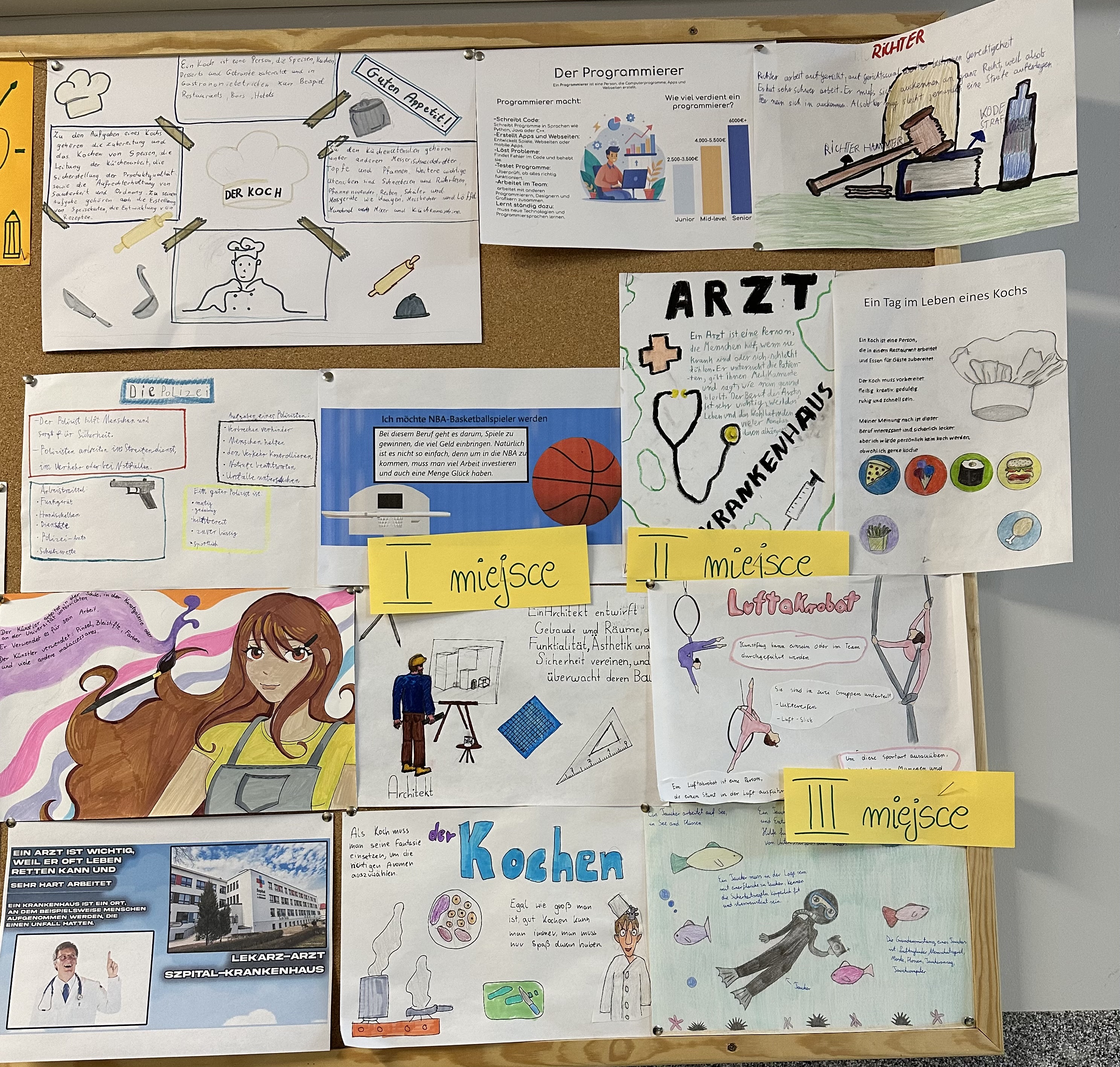 Uczniowie stworzyli oryginalne i pomysłowe prace plastyczne przedstawiające różnorodne profesje, opisane w języku niemieckim. Dzięki temu rozwijali kompetencje językowe, poznawali świat zawodów i swoje predyspozycje, a także zdobywali wiedzę przydatną w dalszym planowaniu kariery.