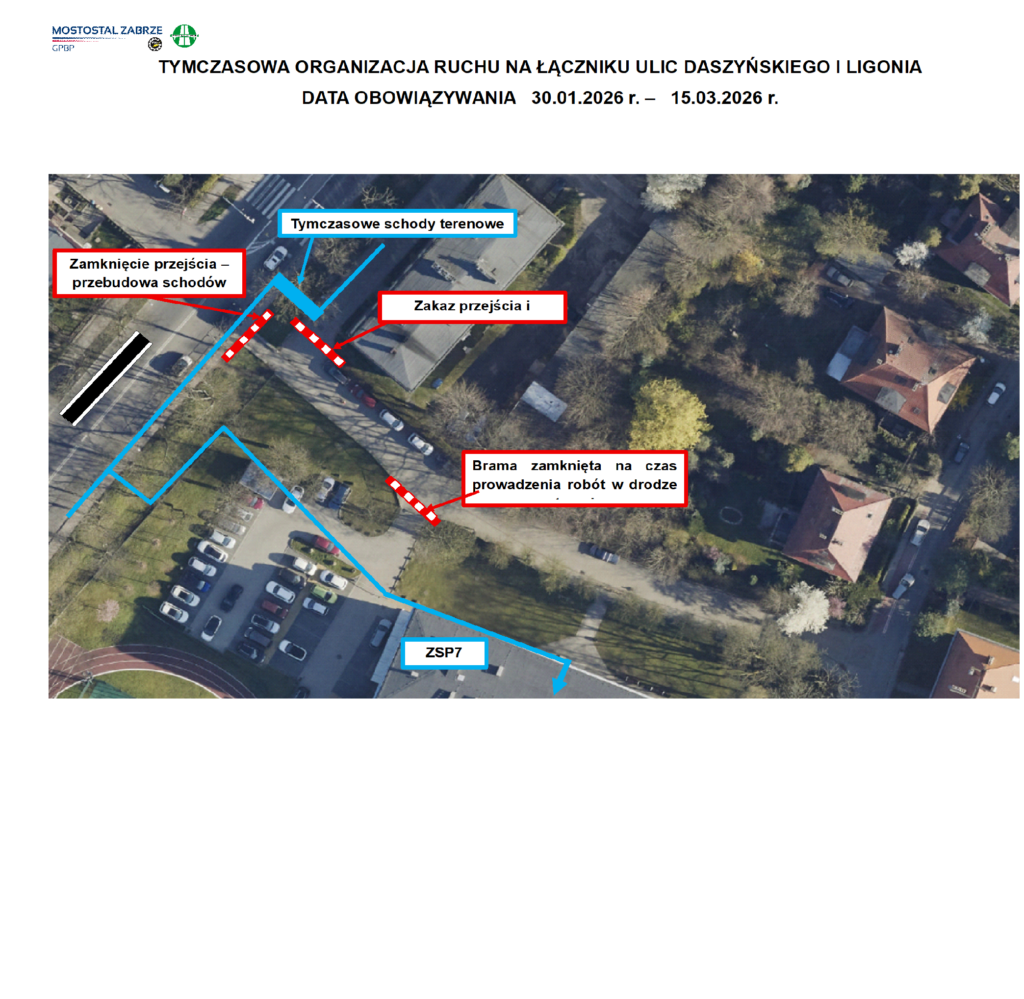 informujemy, że od dnia 30.01.2026 r. obowiązuje zaktualizowana organizacja tymczasowego dojścia do Szkoły od strony ul. Daszyńskiego.