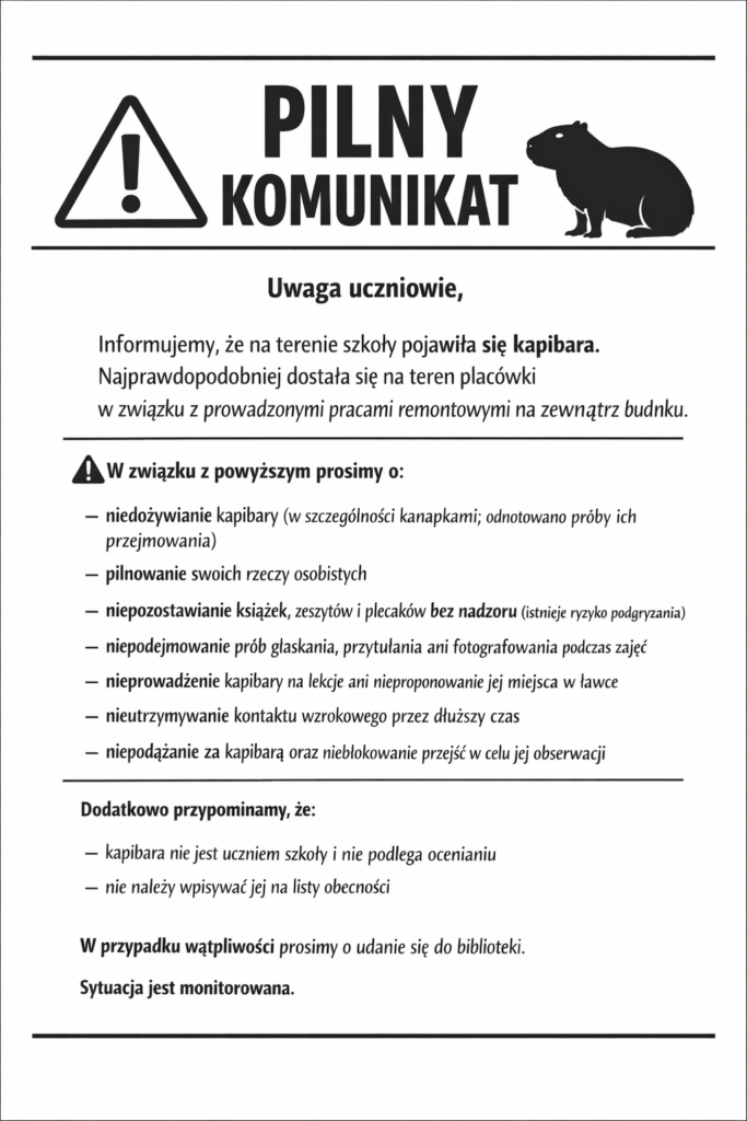 Na terenie szkoły… rzekomo pojawiła się kapibara! Według „oficjalnych” informacji zwierzę miało trafić do nas w związku z prowadzonymi pracami na zewnątrz budynku. W związku z tym uczniowie otrzymali szereg zabawnych zaleceń – między innymi, aby nie dokarmiać nowego „gościa”, pilnować swoich rzeczy oraz nie próbować go oswajać, przytulać czy zabierać na lekcje.