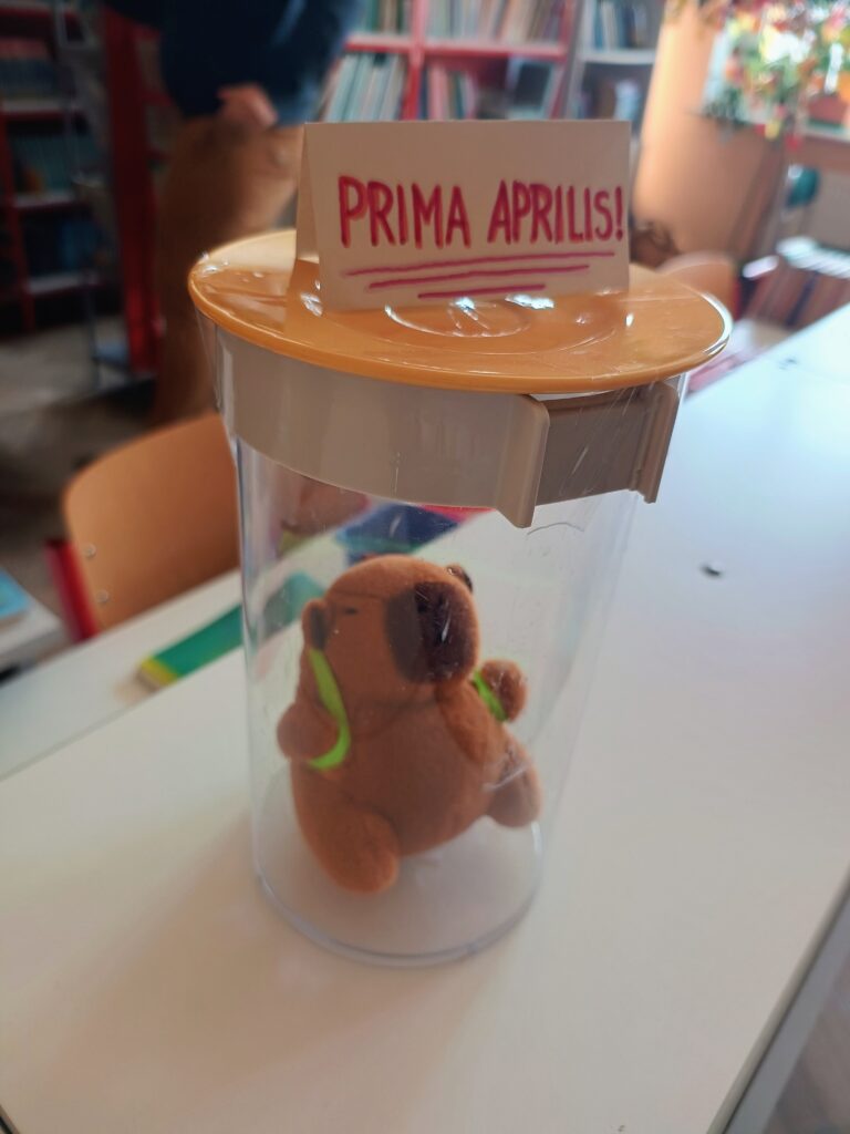 Zgodnie z komunikatem, w razie wątpliwości należało udać się do biblioteki… i tam czekała niespodzianka! Uczniowie, którzy postanowili sprawdzić sytuację na miejscu, odnajdywali maskotkę kapibary z napisem „prima aprilis”, co zdradzało cały żart i wywoływało jeszcze więcej śmiechu.