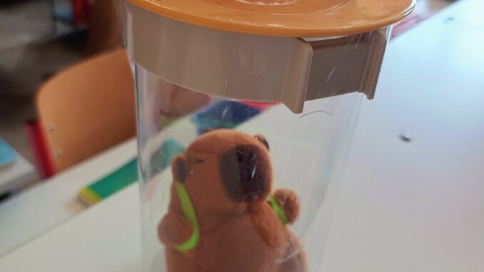 Na terenie szkoły… rzekomo pojawiła się kapibara! Według „oficjalnych” informacji zwierzę miało trafić do nas w związku z prowadzonymi pracami na zewnątrz budynku. W związku z tym uczniowie otrzymali szereg zabawnych zaleceń – między innymi, aby nie dokarmiać nowego „gościa”, pilnować swoich rzeczy oraz nie próbować go oswajać, przytulać czy zabierać na lekcje.