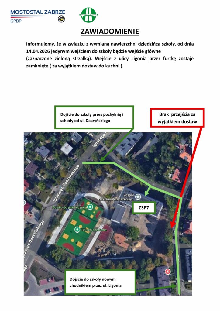 W związku z prowadzonymi pracami polegającymi na wymianie nawierzchni dziedzińca szkoły, od dnia 14 kwietnia 2026 r. ulega zmianie organizacja ruchu w obrębie szkoły.