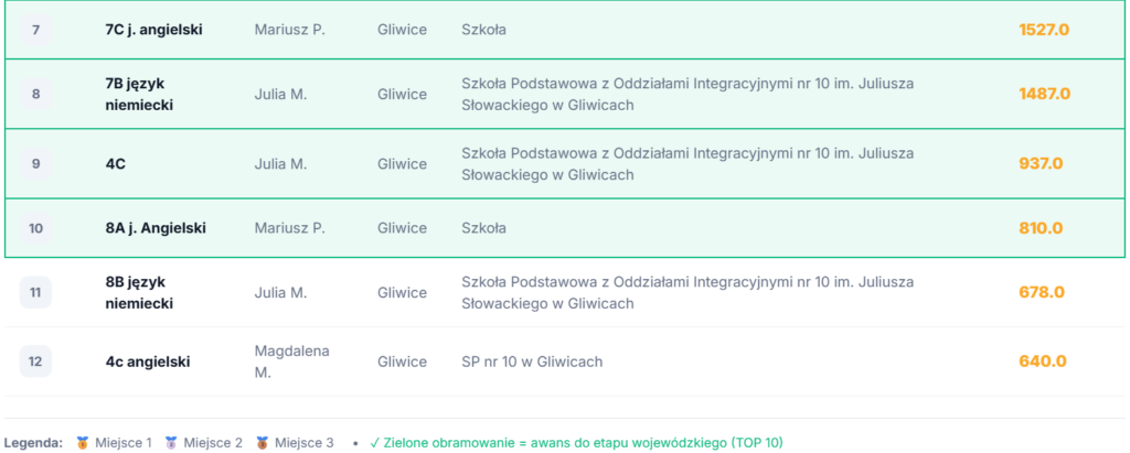 Do etapu wojewódzkiego awansuje TOP 10 klas z każdego powiatu. Klasy, które zajęły miejsca 1–10 (oznaczone zielonym obramowaniem w wynikach), otrzymują dyplomy oraz kwalifikują się do kolejnego etapu zmagań.